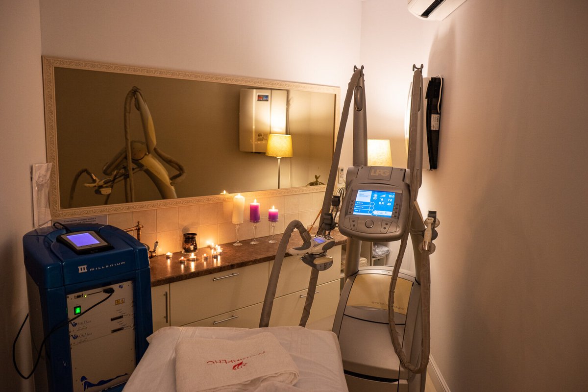 Также к услугам наших гостей антицеллюлитный массаж, массаж головы и лица, окрашивание волос, аппаратная и традиционная косметология, пилинг, солярий, миостимуляция, массаж тела при помощи вакуума, контурная пластика, биоревитализация, мезотерапия, установка мезонитей, ботокс, гиалуроновая кислота, термаж, архитектура бровей, укладка волос, педикюр, рефлексотерапия для ногтей. Принимает трихолог, специалист по мезотерапии кожи головы.